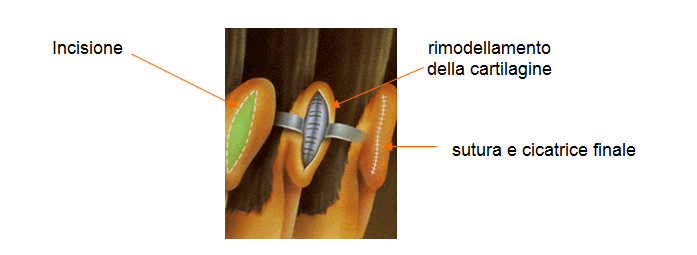 L’intervento consiste nel modellamento della cartilagine o nell’asportazione della sua parte in eccesso. Le incisioni vengono effettuate in sede retroauricolare.